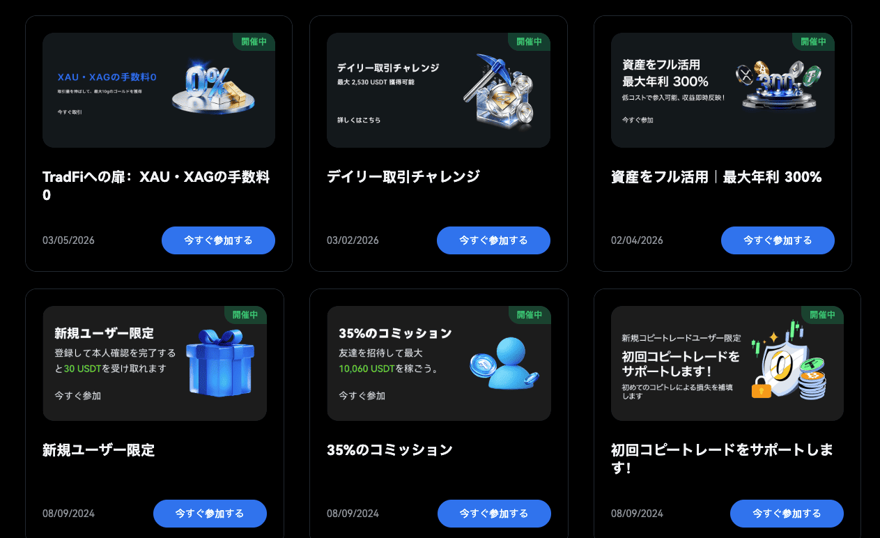 | 初回コピトレ補填 | 損失を最大50 USDT補填 | 新規 |