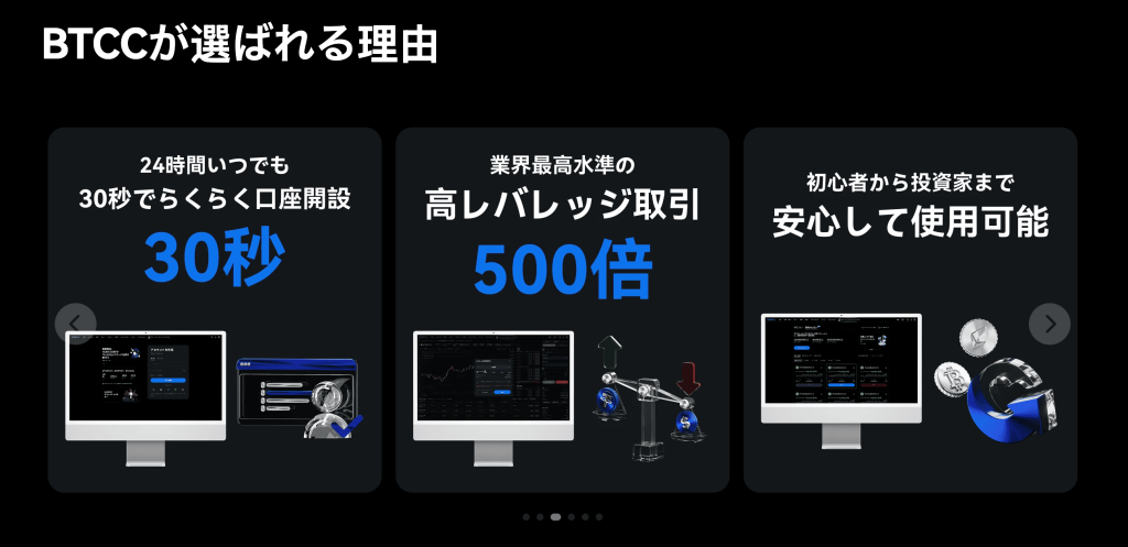 BTCCでは口座開設だけでボーナスがもらえるほか、入金や取引に応じて段階的に特典を獲得できます!