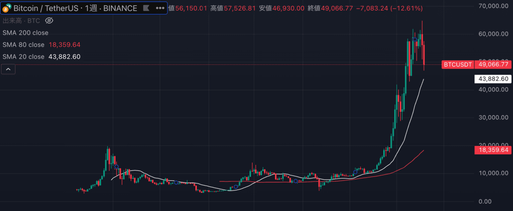 前回バブルの最高値である20,000ドルを超えて65,000ドル付近まで上昇しています。