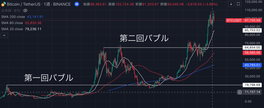わかりやすく第一回と第二回のバブル最高値に印をつけてみましたが、そのどちらのタイミングで購入しても利益が出ている状態になっています。