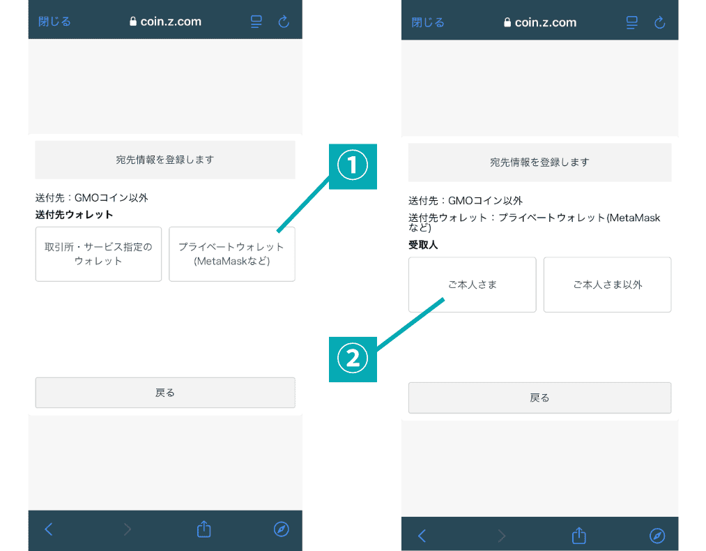 「プライベートウォレット」を選択し、その次に「ご本人さま」を選択しましょう。