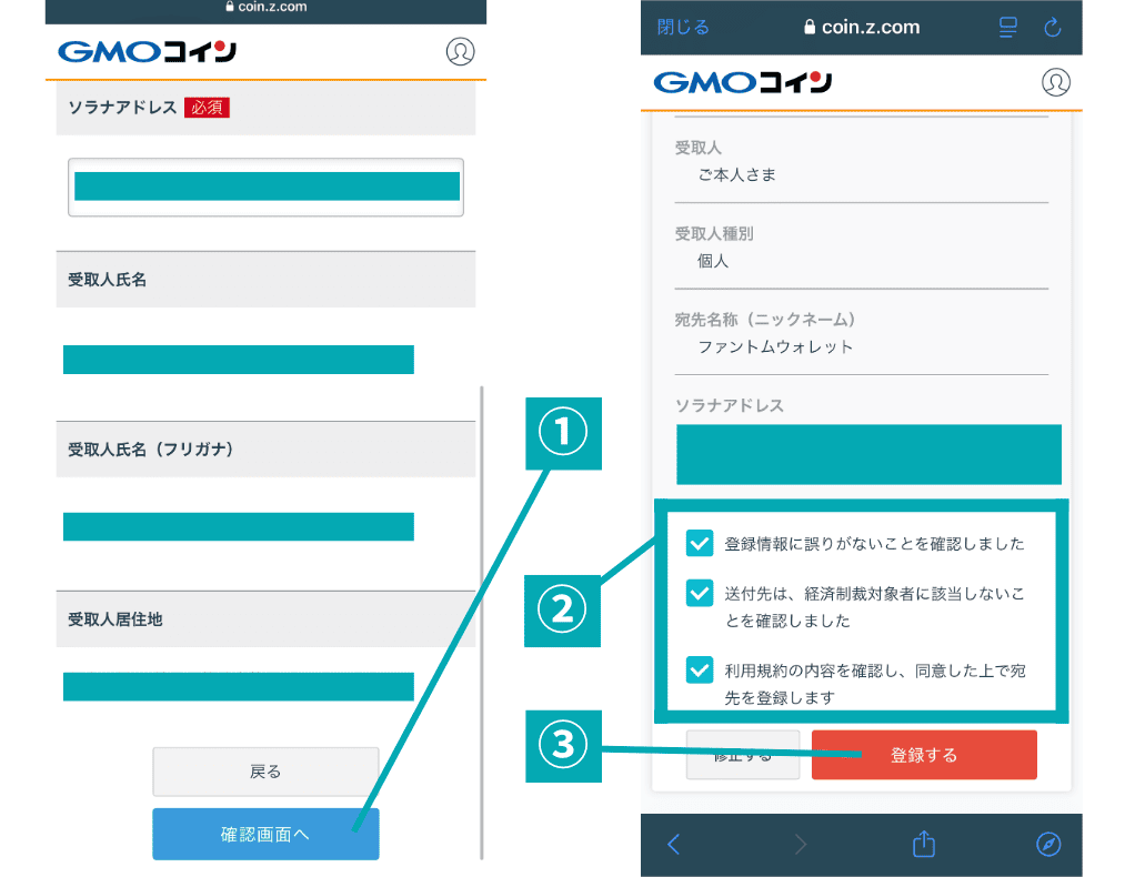ソラナアドレスと他項目の入力が終わったら「確認画面へ」を選択して次の画面へ移ります。