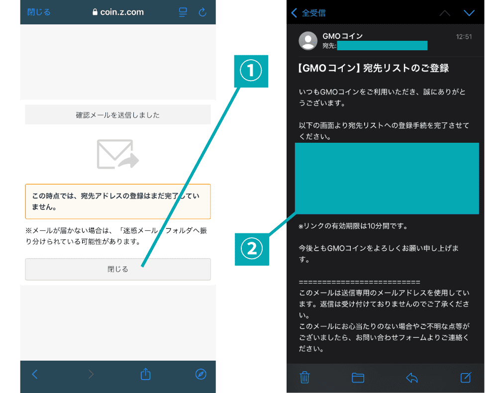 全ての入力が終わると、GMOコインから確認のためにメールが届くので、登録しているメールアドレス宛にきているメールを確認しましょう。