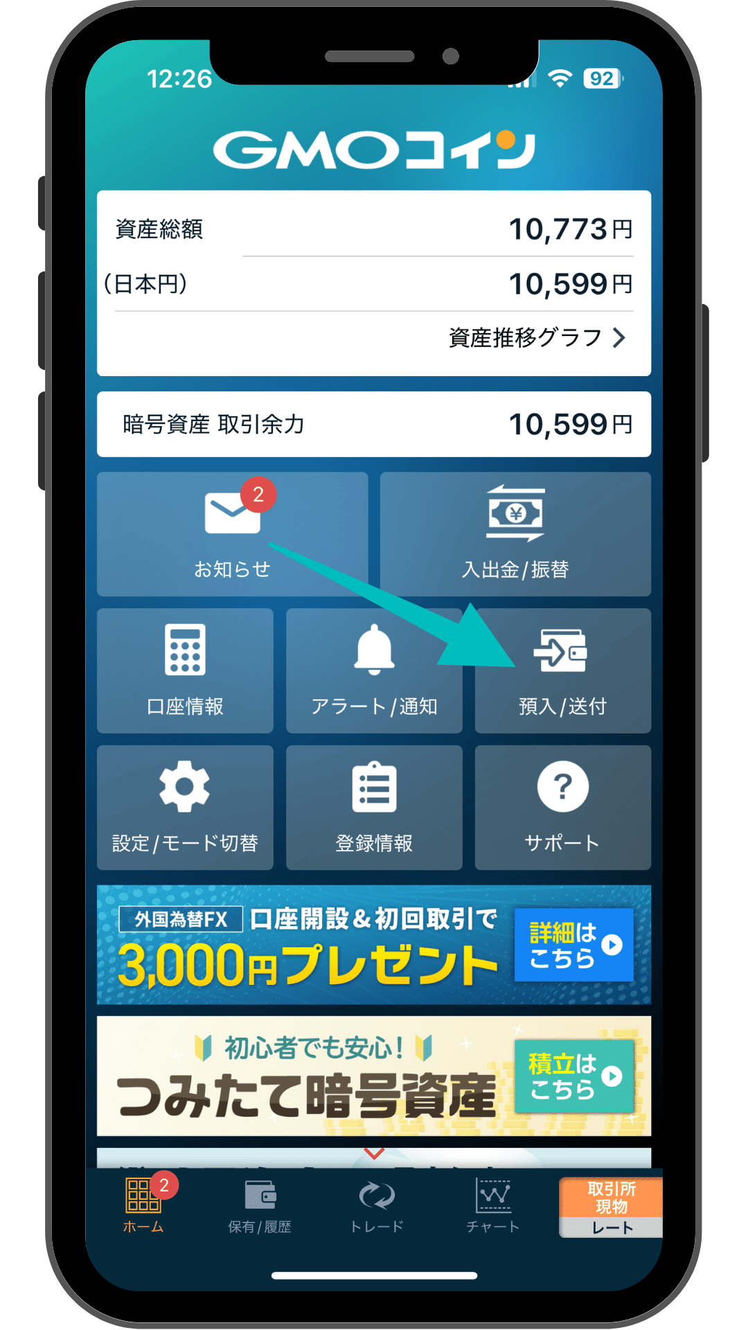SOLの購入が終わったら、アプリのホーム画面に戻って、SOLを送付するために預入/送付を選択します。