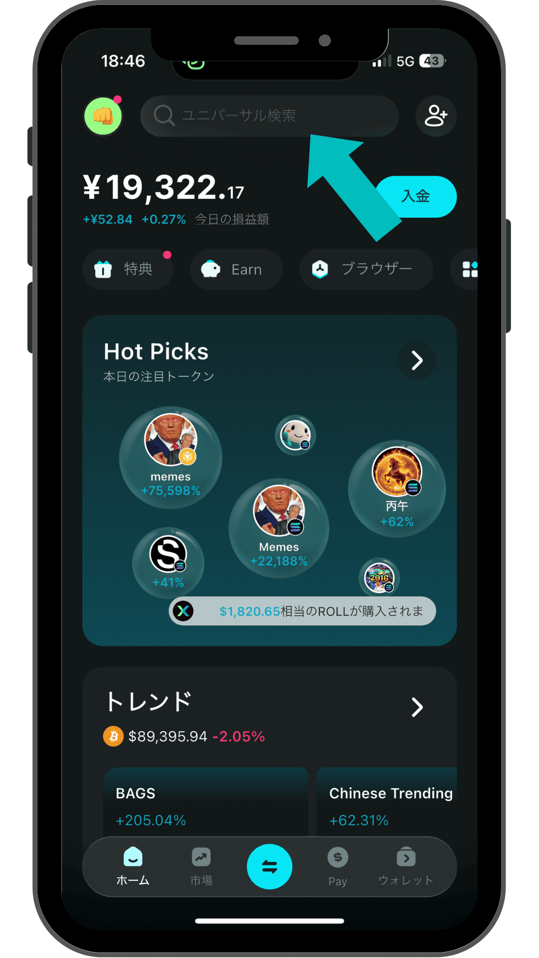 Bitget Walletアプリを開いたら、画面上にある検索欄からSANAE TOKENを検索しましょう。