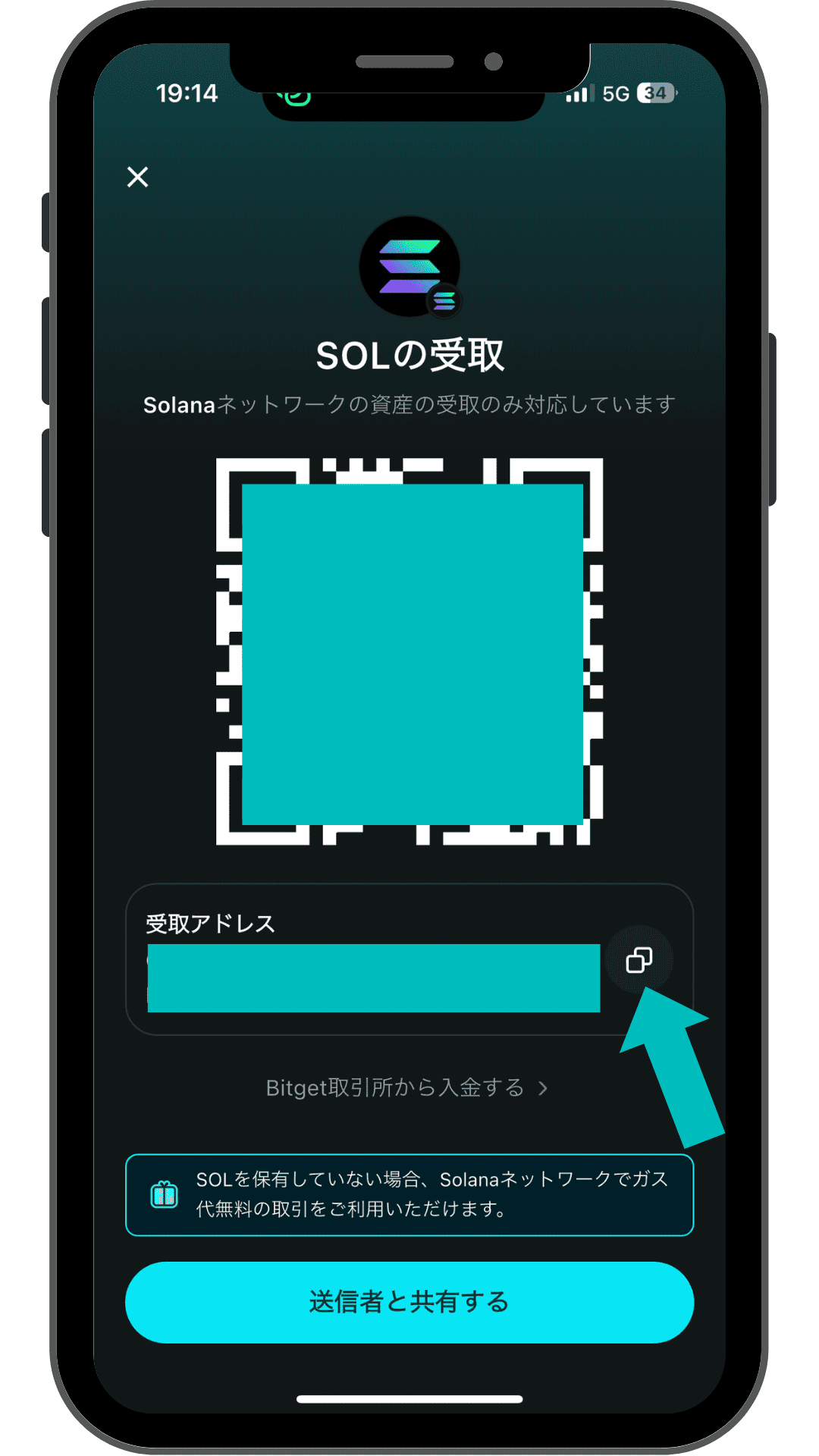 Bitget Walletのアドレスを選択してSOLを送付しましょう。