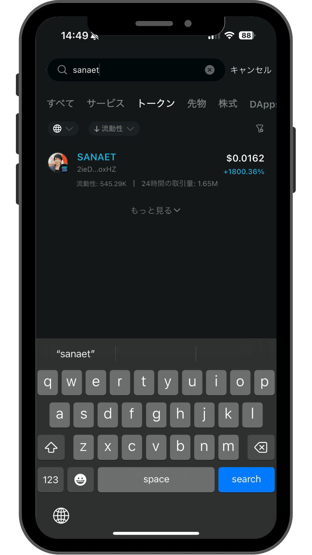 検索して出てきたら、SANAE TOKENを選んで取引画面に進みます。