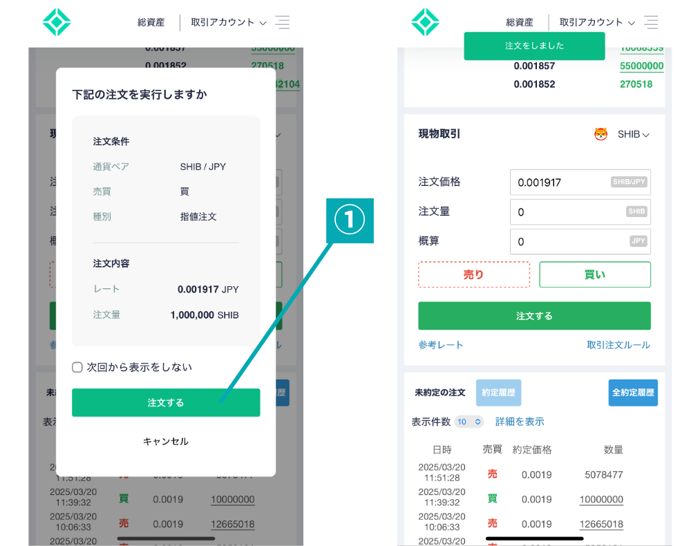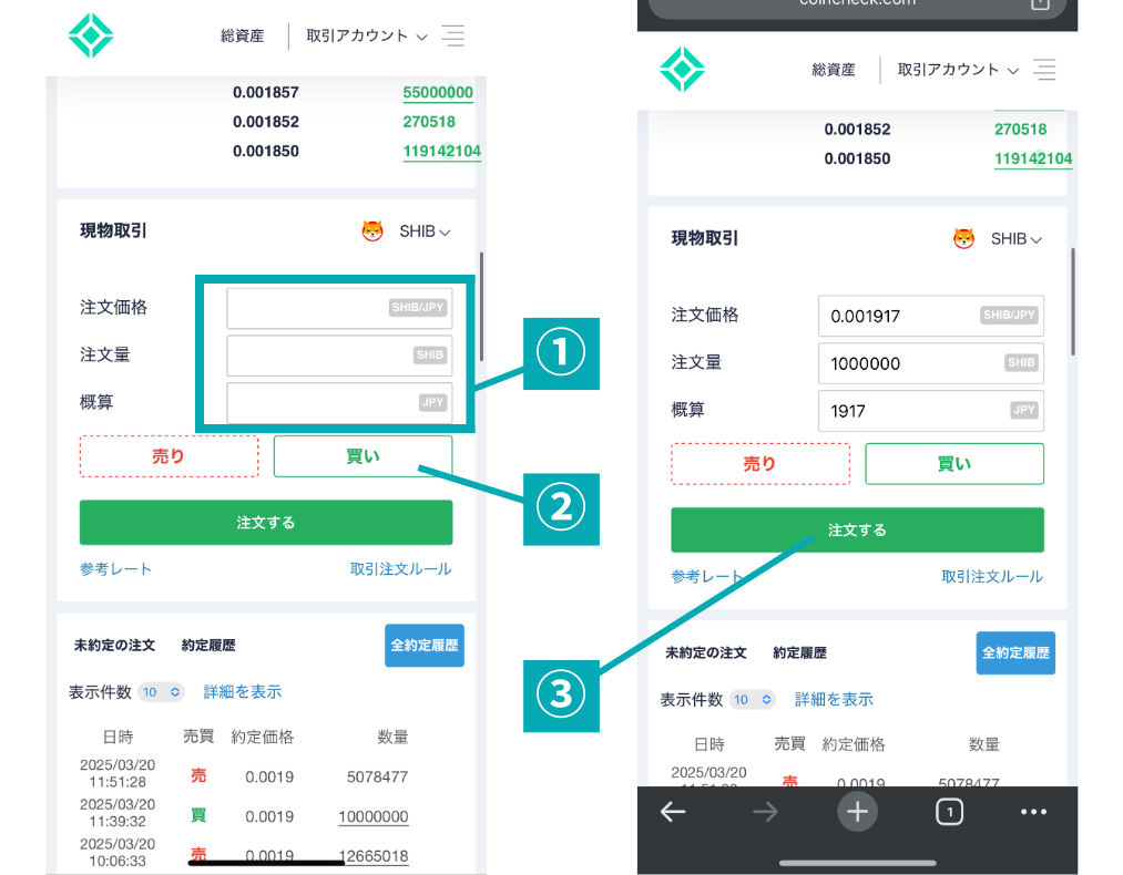 柴犬コインに切り替えたら、すぐ上にある取引板を見ながら購入したい価格と数量を入力します。