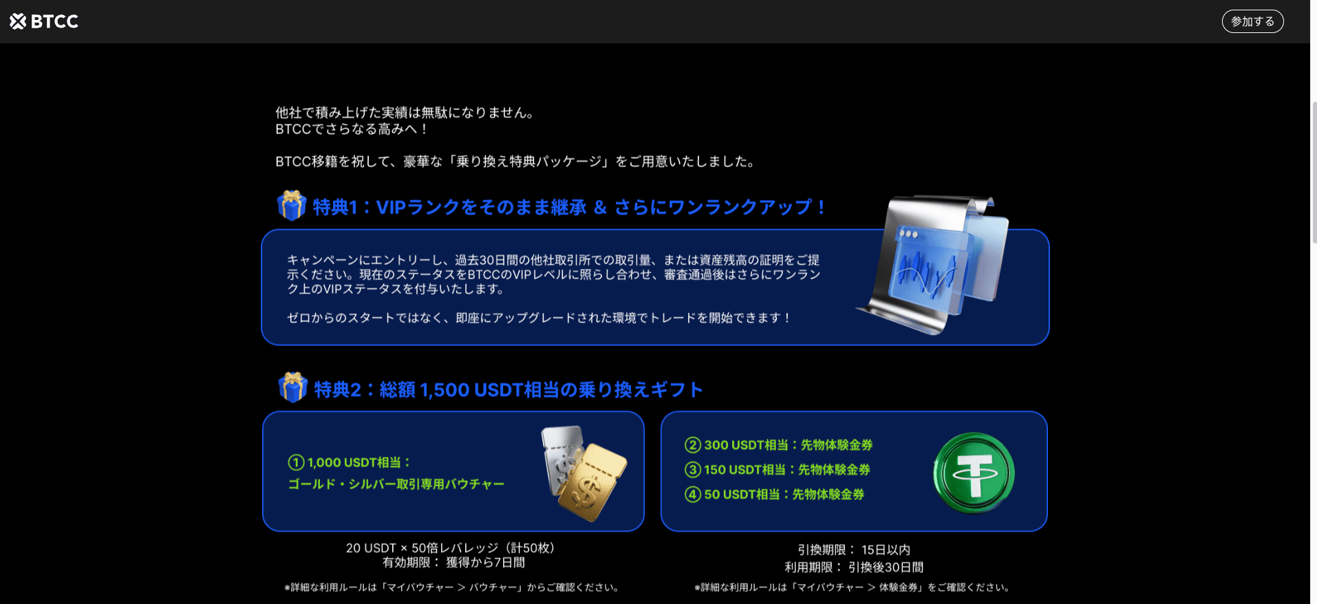 他社でのVIPランクをBTCCにそのまま引き継げるうえ、さらに1ランクアップしてスタートできます。加えて最大1,500USDT相当のギフト(ゴールド・シルバー取引バウチャーや先物体験金券)が3営業日以内に付与されます。過去30日間の取引量証明か資産残高証明を提出するだけで申請できます。