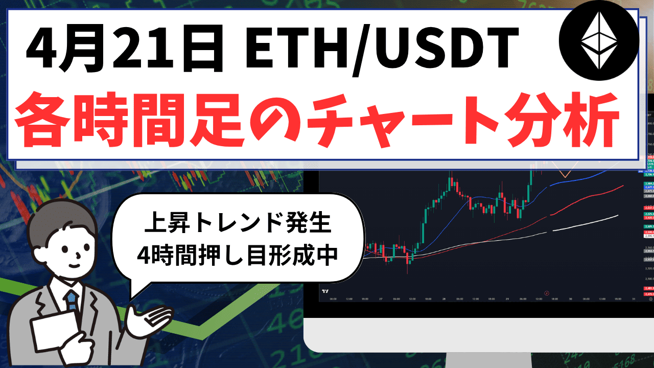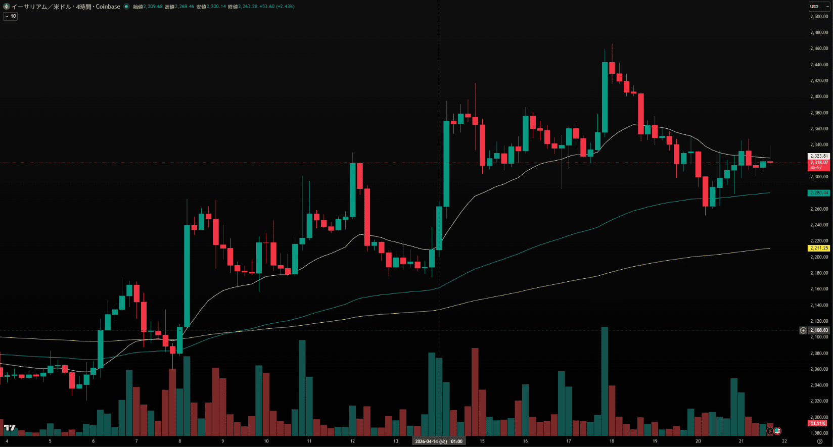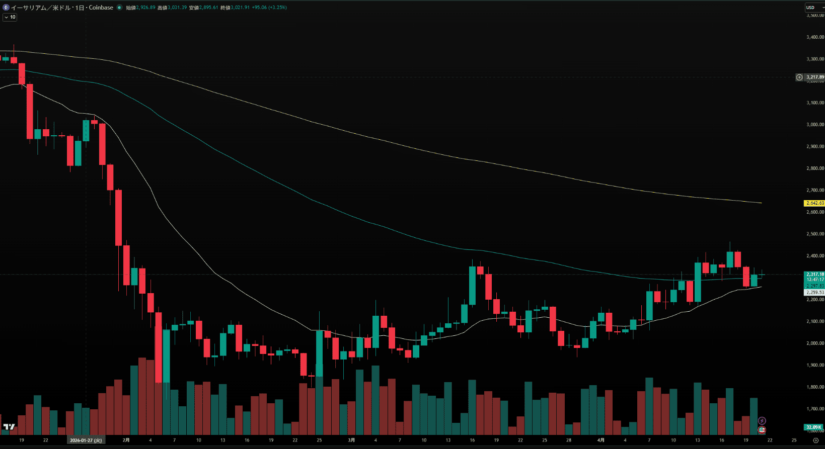 2026年4月21日のETH/USDT(イーサリアム)相場は、市場全体としてリスクオンの方向へ一時的な巻き戻しがかかっている中で、仮想通貨市場も底値からのしっかりとした買い支えが入り、短期的な上昇トレンドが継続しています。