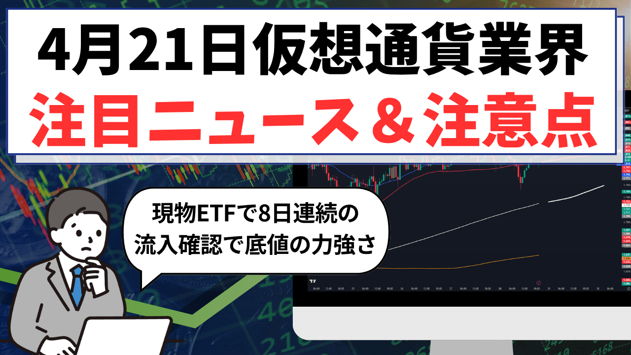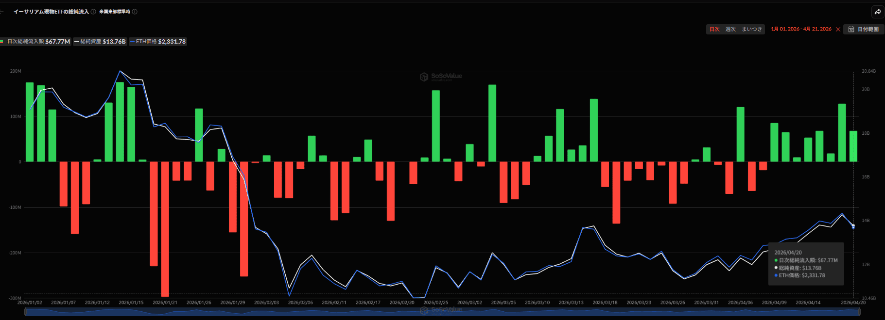 直近8日間連続で、イーサリアム現物ETFへの資金流入が確認されており、これはボトム形成からしっかりと現物での買いが入り、機関投資家による資金投入が再開しているサインです。