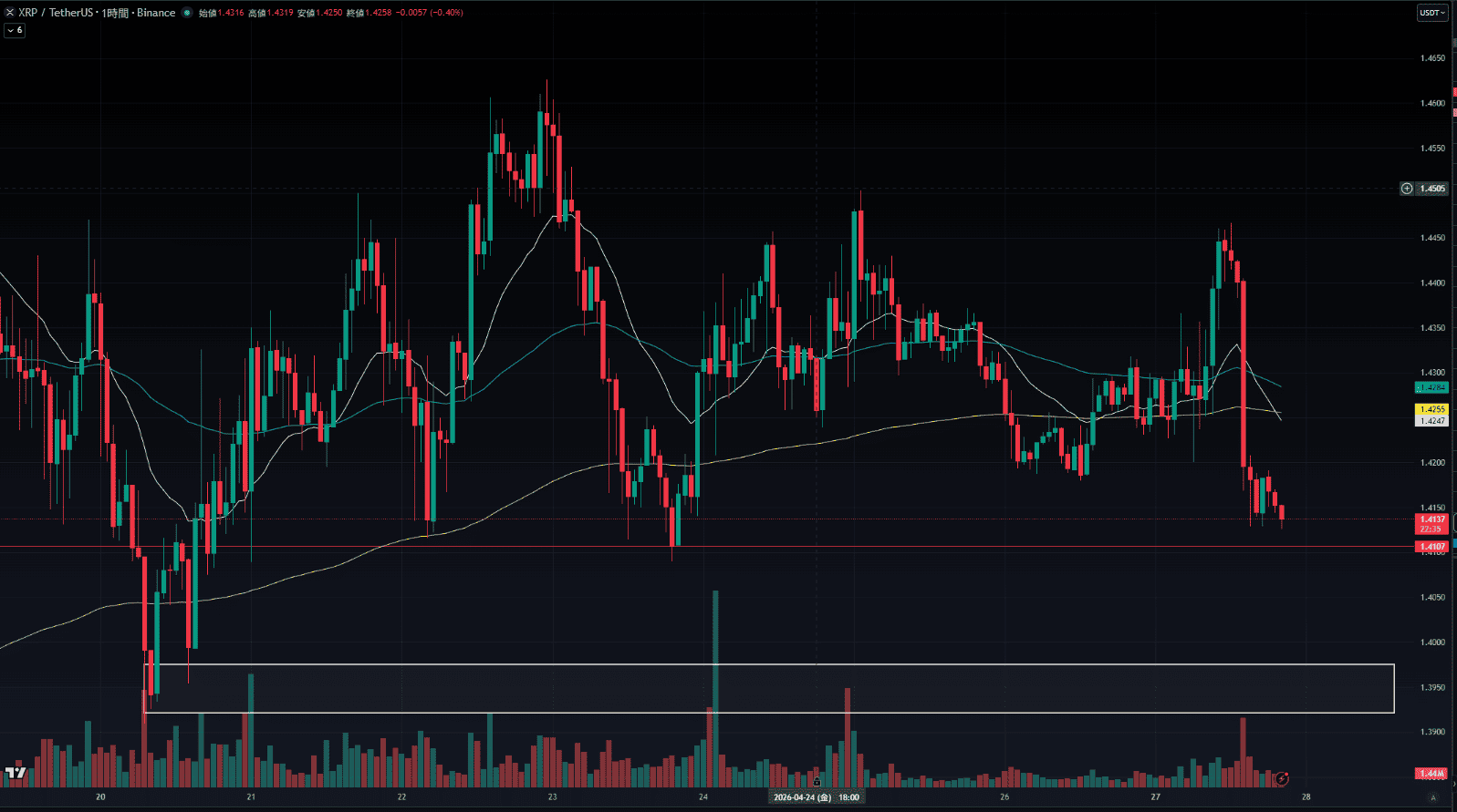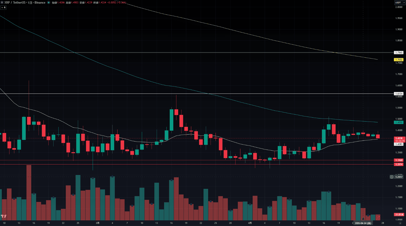 2026年4月27日のXRP/USDT(リップル)相場は、週末、ホルムズ海峡を巡る地政学リスクに進展が見られなかったため、週明けは各金融市場で窓開けからの下落傾向が見られ、一時的に上値が重たい展開が続いています。