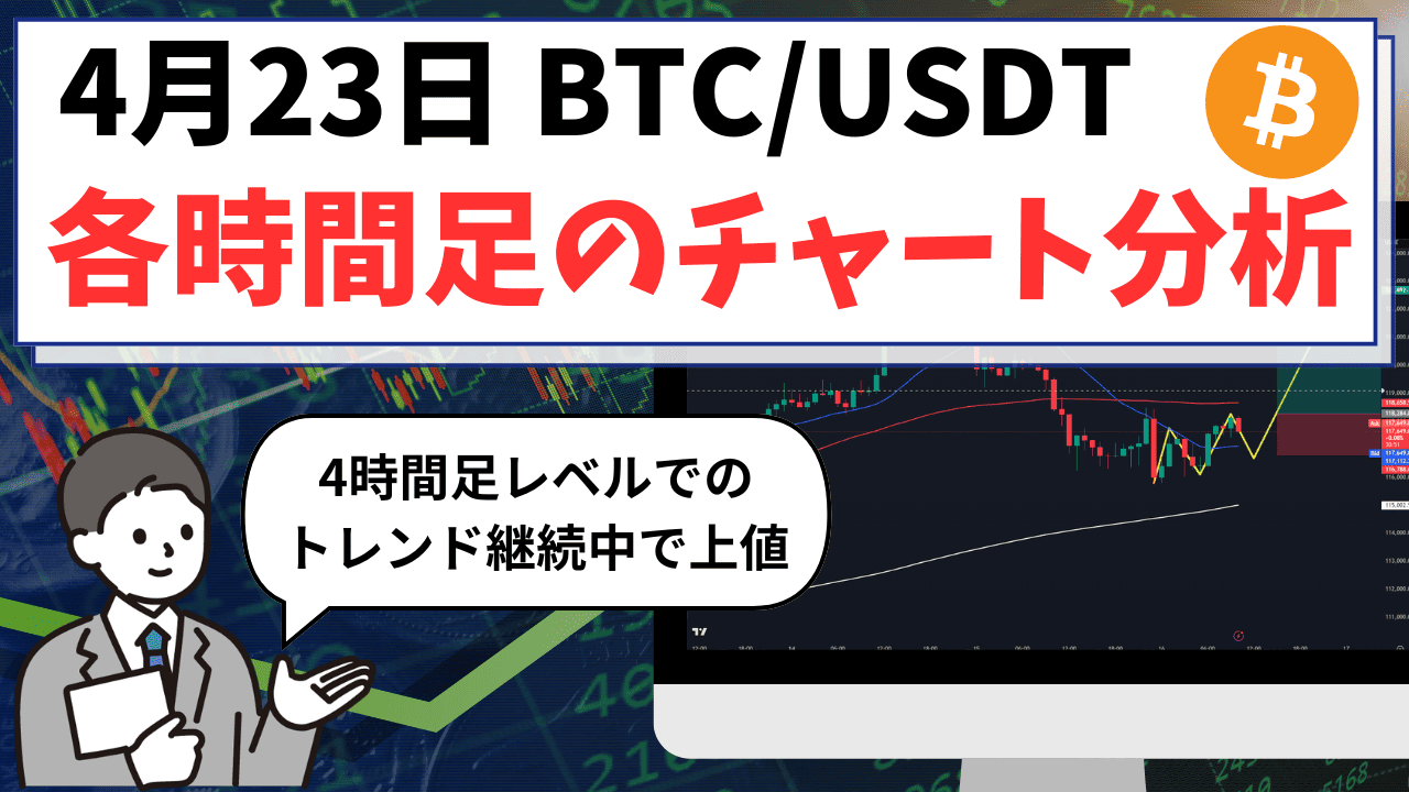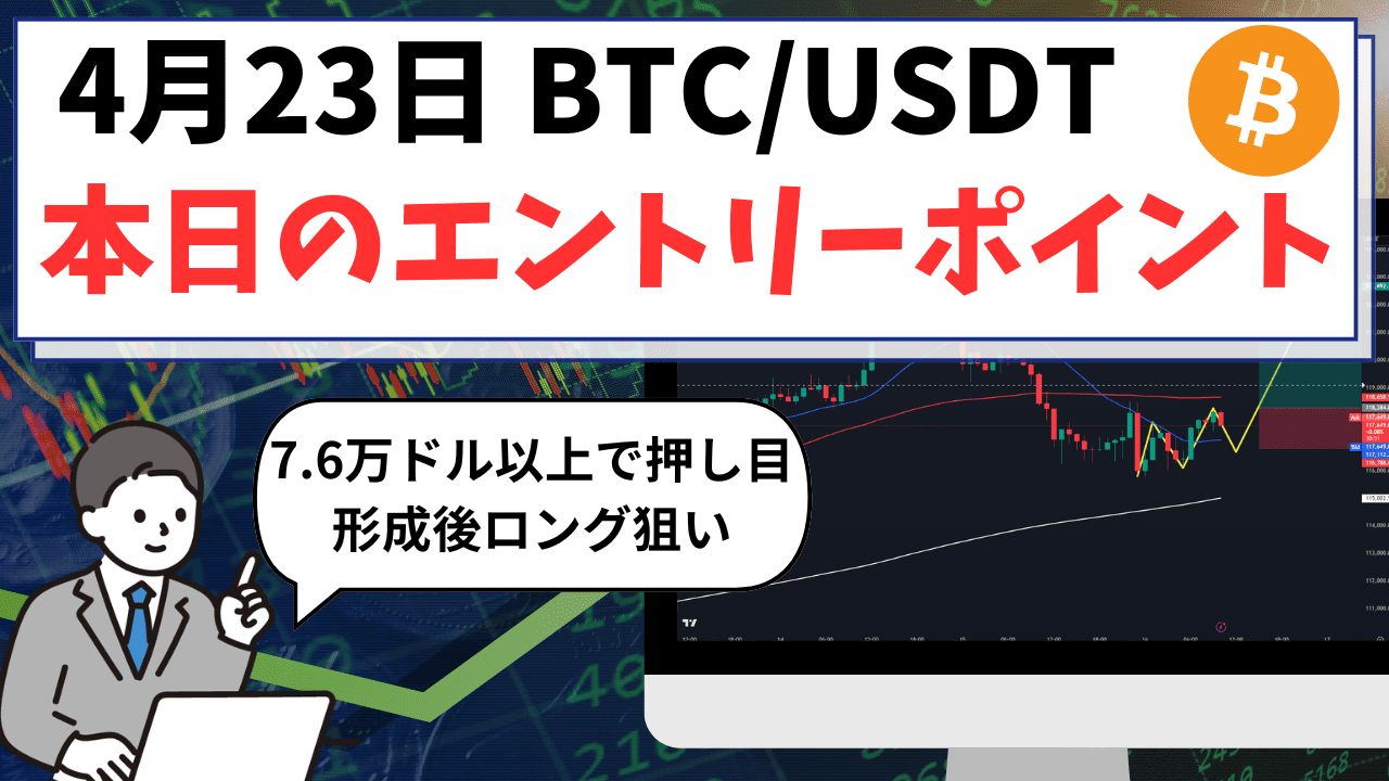 2026年4月23日のBTC/USDT(ビットコイン)相場は、米国株の決算週ということもあり好決算が相次いでいることを背景に、ハイテク株主導のリスクオン相場が形成されています。