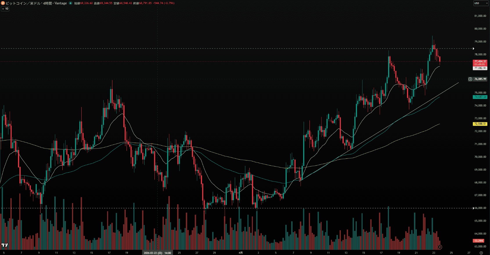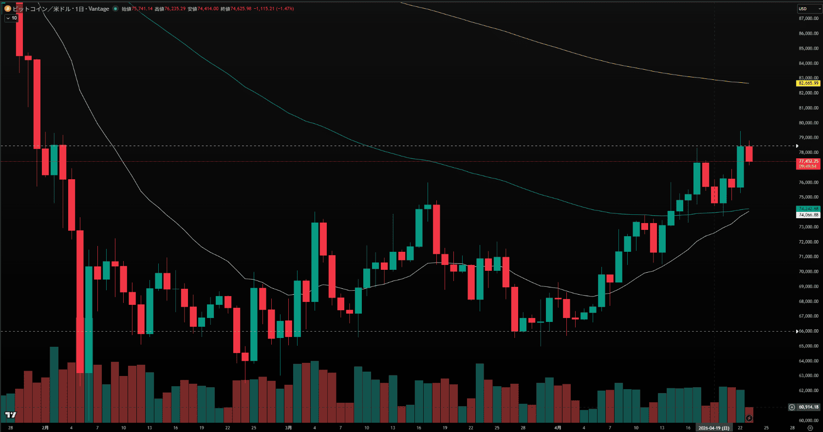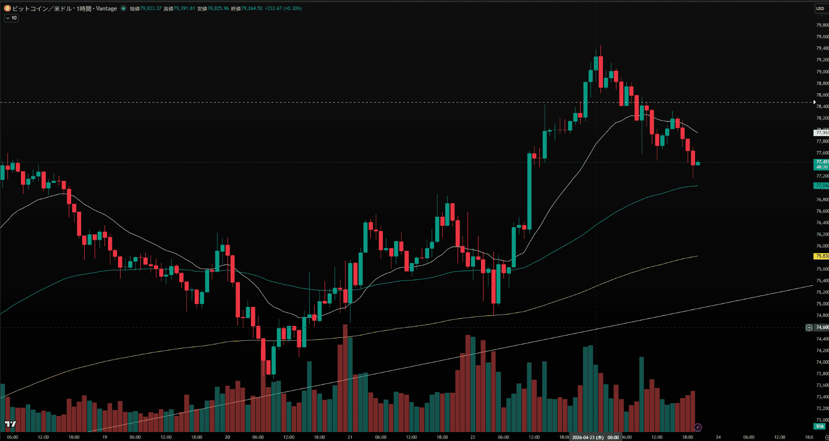 特筆すべきは4月20日の値動きで、上値$78,000付近から戻り(下落)を付けた後、2連続の陰線を完全に包み込むような形での力強い買い支え(大陽線)が入り、上昇を継続させました。