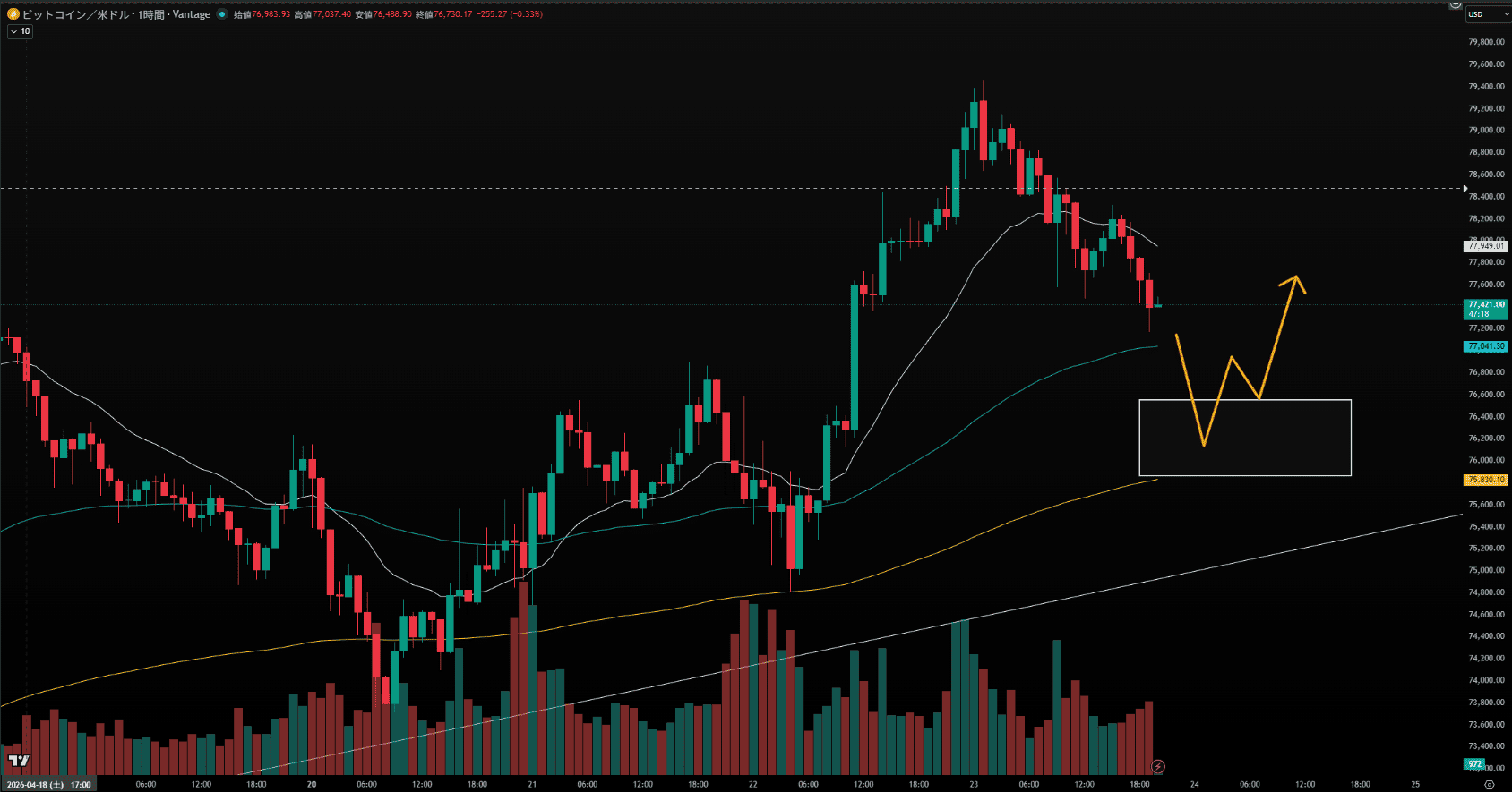 具体的なエントリーポイントとしては、1時間足の長期MAとの乖離埋めやリテストラインが重なる$76,900〜$76,500付近への価格収束を待ちます。