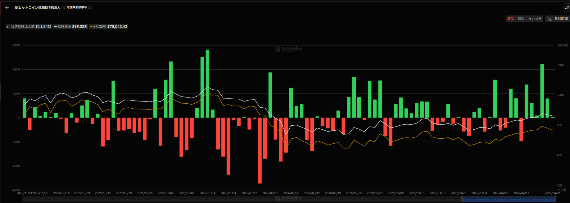 直近のニュースとして最も注目すべきは、BTCにも他の銘柄同様に、現物ETFへの資金流入(買い介入)がしっかりと再確認できるようになってきている点です。