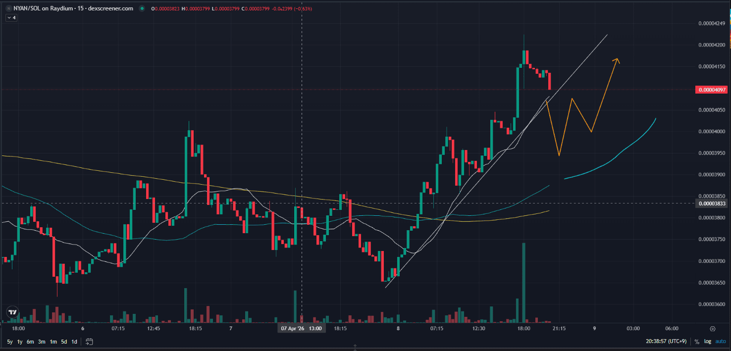 GYAN BLUEコイン(NYAN)相場分析予想|ゴールデンクロス確認、$0.000042 レジスタンス突破なるか