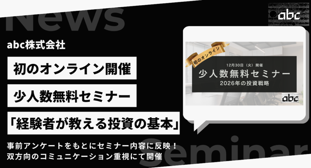 abc株式会社(以下「弊社」といいます。)は、2025年12月30日(火)に初めてオンライン形式にて、投資初心者から経験者まで幅広い層を対象とした無料投資セミナーを開催いたします。企業経営・投資の実務経験豊富な弊社専務取締役 片田朋希が講師となり、2026年の投資戦略を中心とした実践的な投資知識を提供することで、投資リテラシー向上と日本経済の健全な発展に貢献いたします。